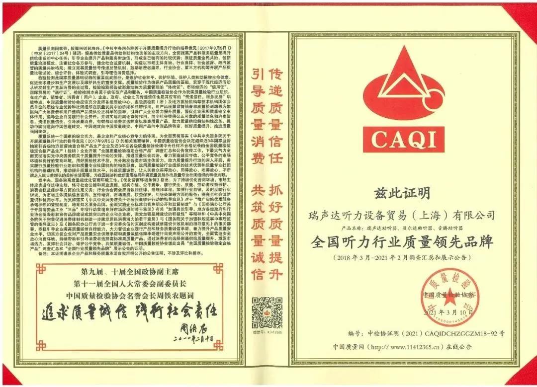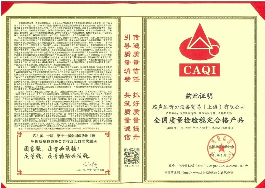 <span style="white-space:pre"> </span>質(zhì)量是企業(yè)和產(chǎn)業(yè)核心競爭力的體現(xiàn)。<br /><br /> 作為對貝爾通助聽器產(chǎn)品質(zhì)量和服務(wù)的肯定,2021年中國質(zhì)量檢驗(yàn)協(xié)會(huì)再次向貝爾通助聽器頒發(fā)了三項(xiàng)榮譽(yù)證書,以期能引導(dǎo)用戶選擇高標(biāo)準(zhǔn)高質(zhì)量的產(chǎn)品,傳遞質(zhì)量信任,優(yōu)化消費(fèi)環(huán)境。<br /><br /> 這三項(xiàng)榮譽(yù)包括“全國產(chǎn)品和服務(wù)質(zhì)量誠信示范企業(yè)”“全國聽力行業(yè)質(zhì)量領(lǐng)先品牌”“全國質(zhì)量檢驗(yàn)穩(wěn)定合格產(chǎn)品”。<br /><br /> 除了貝爾通助聽器,瑞聲達(dá)和音騰助聽器亦同獲此譽(yù)。<br /><br /> CAQI<br /><br /> 全國產(chǎn)品和服務(wù)質(zhì)量誠信示范企業(yè)<br /><br /> 全國聽力行業(yè)質(zhì)量領(lǐng)先品牌<br /></span><p style="text-align: left;"><span style="font-size:16px;"> 全國質(zhì)量檢驗(yàn)穩(wěn)定合格產(chǎn)品</span></p><p style="text-align: center;"><img src="/upfiles/202103160512466507.jpg" width="640" alt="" /> <img src="/upfiles/202103160512463998.jpg" width="640" alt="" /> <img src="/upfiles/202103160512465078.jpg" width="640" alt="" /><br /></p><p style="text-align: center;"><br /></p>" />