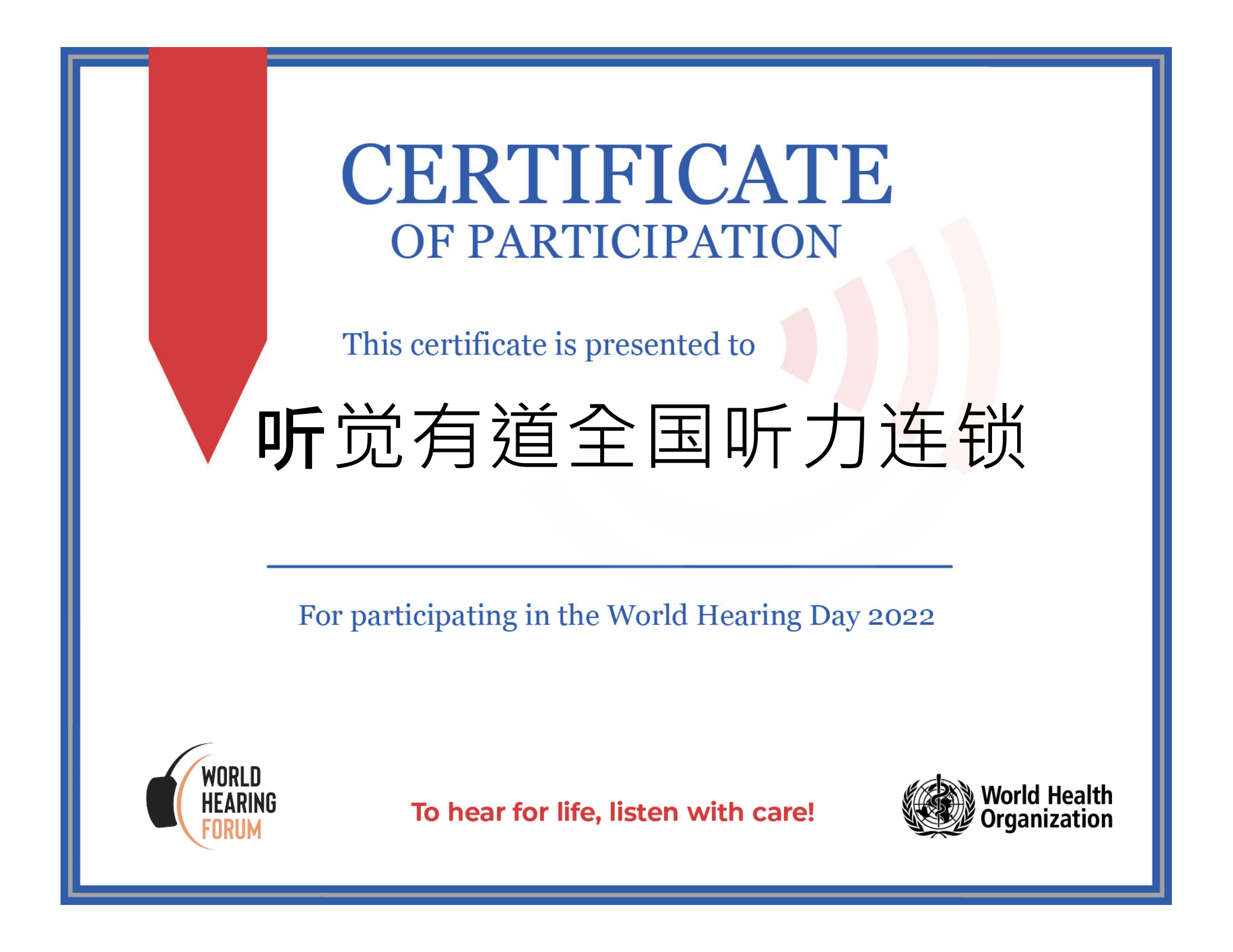 <span style="white-space:pre"> </span>每年3月3日,是世界聽力日,也是全國愛耳日。<br /><br /> WHO(世界衛生組織)對聽覺有道全國聽力連鎖在世界聽力日活動中所作出的努力,給予充分肯定,并于5月10日授予榮譽證書。<br /><br /> 2022年3月,聽覺有道在全國范圍開展大規模的愛耳護耳宣傳科普活動。<br /><br /></span><p><span style="font-size:16px;"> 我們的專業助聽器驗配師不遺余力,為當地居民檢查聽力、宣傳聽力知識、提供聽力解決方案和選配助聽器。</span></p><p style="text-align: center;"><span style="font-size:16px;"><img src="http://www.hlxcw.com/upfiles/202205111115147752.png" width="640" style="font-size:16px;" alt="" /><br /></span></p><p><span style="font-size:16px;"> 關愛聽力健康,聆聽精彩未來!聽覺有道一直在行動。</span></p><p><span style="font-size:16px;"><br /></span></p><p><br /></p>" />